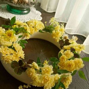 モッコウバラを リース風に 生けました 優しい色に 癒されます.•*¨*•.¸¸♬