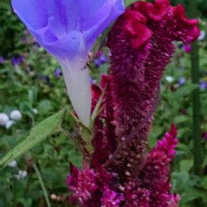 おはようございます😊 早起きして外に出てみたら👀‼️ あら➰😆 玄関の前のケイトウさんにこぼれ種の朝顔さんが~😅 でもケイトウさんにとっては、迷惑、、、ですよね😆 あっち行って〰️かな😆 でも、仲良し😊にも見えるね✨