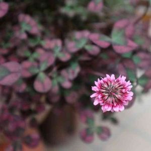 寄せ植えのクローバー ティントワインの花が ひとつ咲いていました。 赤葉のクローバーは寄せ植えの アクセントになります。 ハンギングにもしています。 白い花もいいけれど 大人色の赤い花も もっといい。