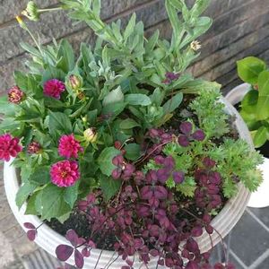 おはようございます🤗 買ったダリアと☘️ 庭に種がこぼれて咲いた冬知らずとノースポール 寄せてみました🌸🌸 今日初孫にやっと会いに行けます \(^-^)/ 生まれて2週間 楽しみです💕