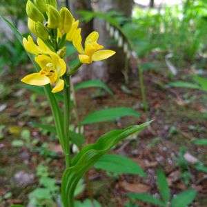 【金蘭】 菌根菌や他の樹木への依存性が高いため人工栽培はきわめて難しい。 雑木林の放置、野生ランのブームによる乱獲などによって銀蘭と共に減少し、絶滅危惧Ⅱ類に指定されている。 この場所では、昨年に比べるとかなり多く見ることができる。銀蘭は少なく、離れた所に数本しか見当たらない。どうか来年も、その先もずっと… 林の中でひときわ輝く元気色の花姿を見せてほしい 💙💛