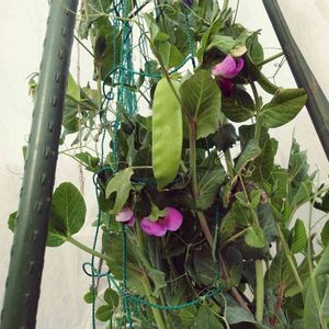 過保護シリーズ2。さやえんどう。 育ちが早いのか、花が咲いて、実もなっています。 ネットを、張ってその上から、100均不織布で防寒対策です。 果たして冬を越えられますか。