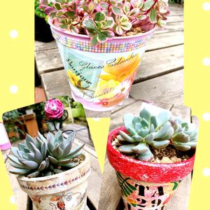 おはようございます😃☀☀☀ 梅雨開けましたよね。 過保護に、育てていますので、 バラバラ事件に、なってないです。 上のは、ピンクのポーチュラカ💕💕 お水あげるのが怖くて😱😱😱 まだ、あげてないです。 ペーパーを重ねて、文字を いれました。ペーパーは、100均一のです。デコりました。 左側は、ニバリス、ツンツンしてるので インディアン風に 右側は、ラセット、ステンシルとデコのコラボ、鉢の色、スポンジ🧽で、ペタペタ、 鉢と多肉ちゃんがマッチしたので 嬉しい╰(*´︶`*)╯♡