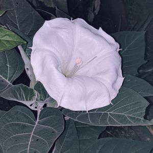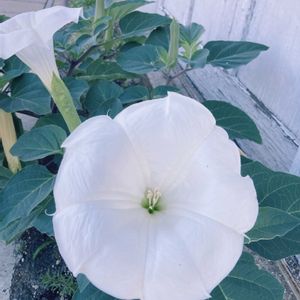 朝鮮アサガオ ナス科 チョウセンアサガオ属 昨年 秋に発芽し、冬越しさせて育てたものです🍀 ようやく、今晩 開花が始まりました。 明朝は全開していることでしょう。