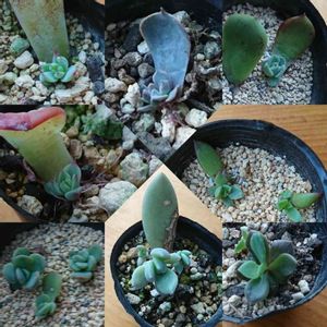 葉がとれた子や伸びた子で✂️した時に外した葉…ダメになりそうになって慌てて葉をとった子… ちゃんと遺伝子を受け継いですごいなぁ~😊 左上左真ん中は桃太郎🍑ちゃんと特徴がわかる😊 🏷️毎月13日と14日は葉挿しの日に 参加させて下さいね😊
