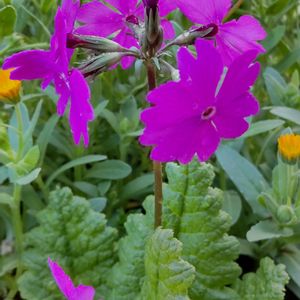こぼれ種から苗を育てた、普通のサクラソウが、寄せ植えの鉢に入れたら、モリモリになりました。 他に葉牡丹、サルビア、白妙菊などと一緒に植えたら、花の茎がぐんぐん伸びて、葉がどんどん大きくなり、他の植物の葉を覆い尽くすほど。他の植物が可哀想に思えるほど大きくなっています。 ①真上から花の部分を見ると ②真ん中の蕾 ③横から普通に見ると