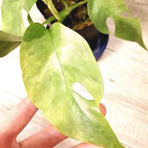 (*´◒`*)WOW!! うちの出世頭♡ ラフィドフォラ・テトラスペルマ・ホワイトバリエガータ(イエローに見えるのは光加減💦)(^^) 元ヒメモンステラの斑入りですねん 親株は9年育てている横120cm、縦150cmに育った普通のラフィドフォラだけど、剪定したのを発根させたところ、葉脈にそって黄緑が入った斑入り2株と、この様に白が出た子が1株、合計3株だけ出まして(* ´ ˘ ` *)フフフ♡ 写真の子、すくすく育って、さらに剪定発根させ今は3姉妹になってるよぉ(*'∀'人)♥*