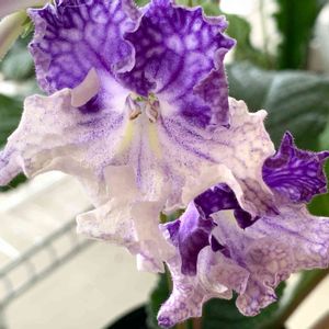 ストレプトカーパス カウカウ 赤穂さんの今年の新品種です🌸 実物はもう少し青っぽい紫で、下側の花弁は黄色です 小輪だけどフリルと八重で存在感があります