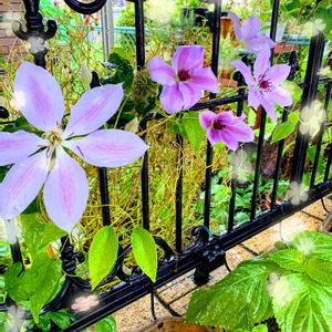 今朝の庭から😅 クレマチス日陰なので時期がずれて 無事咲きました☔️