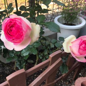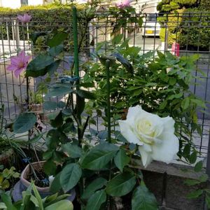 お早うございます🎵 薔薇の鉢を動かしてクレマチスとコラボ‼️ 二つの花を同時になんて贅沢かも💕💕