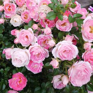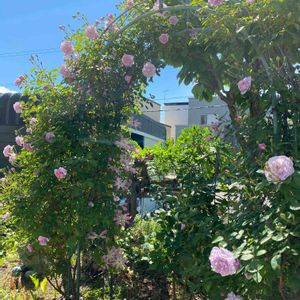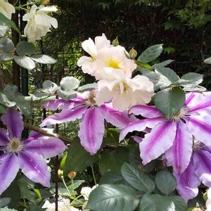 こんにちは☂️ バラかおりかざりと クレマチス ピンクファンタジーのコラボ🎶💕 二番花のかおりかざりは お花が小さいですが花束のように、雨にも負けず咲いています🌹 クレマチスは薔薇の最盛期は咲かなかったですが、今満開です❣️