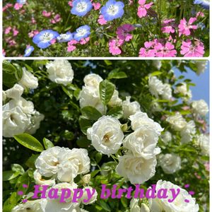 大好きな花友さんへ💕 お誕生日おめでとう🎂🎉 外出先の 大好きオルレア🤍ワスレナグサ💙たちとお祝い🙌 これからもお花やトーク 楽しみましょう✨🫧🥰 よろしくお願いします😊 ②おうちのニゲラ🤍 去年のこぼれタネから 咲いた咲いた〜🎶 嬉しいな💕🥰 お仕事頑張ります(ง •̀_•́)ง 今日も暑いようなので、水分補給 しながら乗り越えましょう🎵