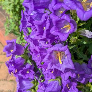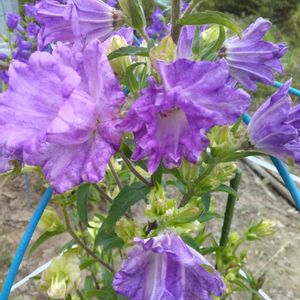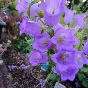 カンパニュラ ちょっと前に開花したのですが豪雨で倒れてしまったので、切り花にしました。 脇から出てきた花のおかげで花壇が華やかになっています🌼
