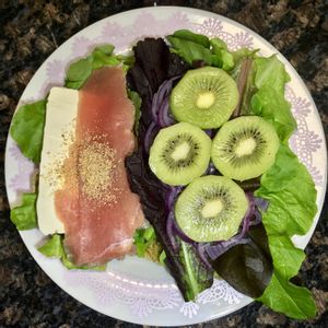 サニーレタス、ロメインレタス 、フリルレタス、赤レタス,キウイと、ルッコラ、生ハム、オリーブ、クリームチーズのサンドイッチ。キャベツ練り込みパン使用。
