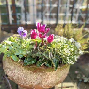 寄せ植え♡ 20年以上愛用している植木鉢♪ 周りには苔が着いて 足の部分が欠けて… いい味だしてくれてます〜(*´꒳`*)〜 カルーナ・アリッサム ガーデンシクラメン・ビオラ