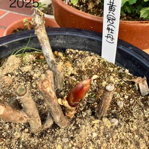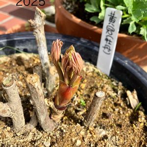 昨年秋に狂って葉を出した花芽。 生産者さんには『冬に枯れてしまうのでもうその芽はダメになります。枯れたら切ってください』と言われていたんですが、ワンチャンないかな〜!と思っていたらワンチャンありました。 やった〜!!!枯れた葉の根元に花芽出ました!!! ただ他の枝の花芽は全部枯れたっぽい。2025年一年目のボタンは一輪だけかな〜しょんぼり。