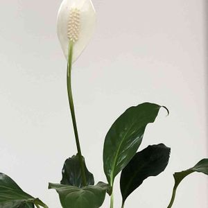 スパティフィラム。 サトイモ科 白い花びらのように美しいのは仏炎苞(ぶつえんほう)と呼ばれる部分で、花はひも状の部分(肉穂花序:にくすいかじょ)に多数つきますが、小さく目立ちません