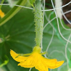 こんにちは👋😃 雨が、降りそうで、降らない蒸し暑い日です。 きゅうり夏涼み 水やりしていましたが、 雨が降っていたので、 5.6日を世話せず目を離してました。 子蔓が伸びて偉いことになってました。 花が咲いて小さな実が 出来てました。 とりあえず支柱を、2本増やして巻きひげが、頼れるようにしました。 ミニトマトの鉢が、片付くまで、応急処置しました。 小さなきゅうりは、10cmくらいで、収穫するそうです。 子蔓も、3節で摘心したら、良いそうです。 ハモグリバエの被害にも、負けず、勢いにビックリです。 植え付けて半月足らずです。 6月17日植え付け