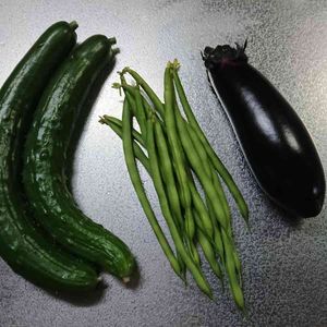 おはようございます☁️ 30分ほど前に採れたばかりの ホカホカ?の野菜たち🍆🥒 「こんなに太い支柱あった?」って見間違えた尺物(笑)の🥒 苗が弱り気味のナス🍆は、小さいうちに採りました ちょっと心配です😳 今日も一日ぼちぼちガンバりましょ😊✋