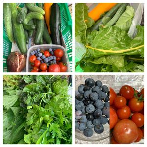 今日の収穫 きゅうり🥒 ミニトマト、桃太郎🍅 ズッキーニ ブルーベリー 青紫蘇 イタリアンパセリ スイスチャード セロリ オカワカメ イチジクドーフィン おはようございます☔️ 昨夜から☔️が降り久々の☔️模様 畑整理の為葉物を収穫