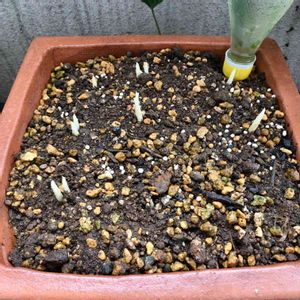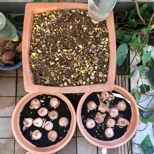 サフラン植え付け。四角鉢には既に植えていて、左下に芽が出ています。丸鉢はこの後土を掛けます。
