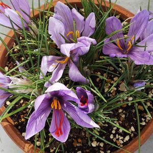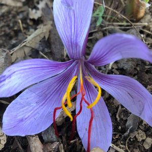 サフランの花が咲きました✨ かわいい花ですね🌸 赤いぴょろ〜んって生えてるヒモみたいなのがスパイスとして使われます♬ 世界一高価なスパイスらしいです〜