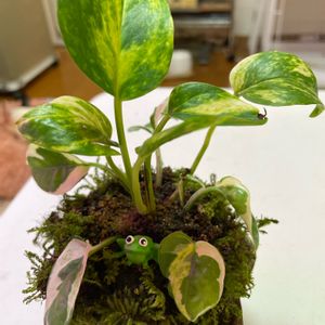 (*´◒`*)WOW!! 苔玉、元々植えてあった植物が水分が多いと根腐れしやすい種類だったから植え替えしたら、穴のあいた苔玉だけが残って、それがずっとあって💦 でも、まん丸の苔玉って私的には好みでなく、周りにコケリウム用の苔を植え、上部にはポトスゴールデンとエンジョイを植えて🐸をチョコン💓 これでかわゆす~(*'▽'*)♪