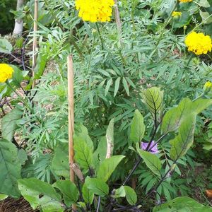 おはようございます🙋 🍆茄子とマリーゴールド、ししとうも一緒に😉コンパニオンプランツ😊👌 マリーゴールド🎵お花も綺麗ですね👍