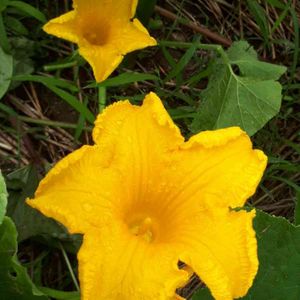 我が家の畑😊👌 朝🎵水やりした後 南瓜🎃の花に水滴💧 さて🤔今年はいくつ収穫できるかな?😆 楽しみです