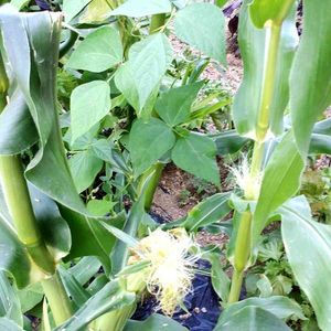 おはようございます😊 コンパニオンプランツ 🌽トウモロコシと平いんげんです😉👌 さて🤔どうなるのかな? 平いんげんはなりまじめてます🙆