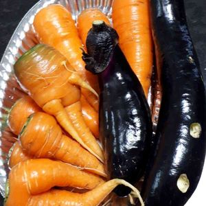 人参🥕と茄子🍆😋👌 収穫しました🎵 ダイソーの種から出来た人参でぇ~す😁 茄子は苗買ったよ! でも穴が2つもある誰が齧ったんだろう?🤔