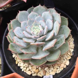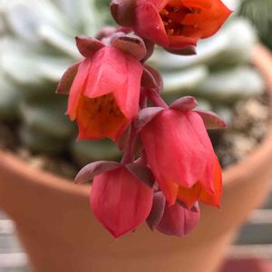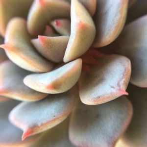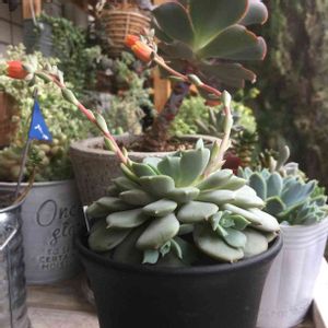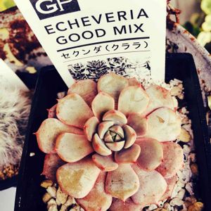 エケベリア属、セクンダ(クララ)? 値札のシールに薄く小さくセカンダって印刷されてたので忘れない様にセカンダと書いたけど検索すると違ったみたい😅 皆さんのより葉が薄いけど厚くなるのかなー。 花芽は写真撮ったあとにカット✂