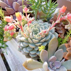 今日も風が冷たくて寒かった🍃 名前変更しました。 先月作った大型の寄せ植え フリマで買った長方形の赤いブリキ缶に底穴を開けて、白く塗って 大きくなりすぎて持てあまし気味だったエケベリアや、 木立ちしたり暴れた多肉を入れました🎵 育つのを想定してちょっとだけ余裕を持たせて植えています。 ブロンズ姫に蜘蛛が住んでる様ですぐクモの巣張る😅 パールフォンニュルンベルクとオパリナとブラクテオサムは 土が少なくて葉が薄くなったからここで復活して欲しい。