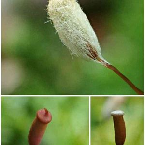 スギゴケのサク。 毛がとれると 蓋がむき出しになって サク歯が見えます。 毛の下にこんなかわいい 蓋が隠されています 笑