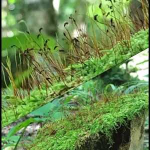 達沢不動滝までの小径🌿 苔こけコケ苔こけコケ苔✳️… その2 下🌱木の切り株の上に苔 上🌱ズーム🟢苔の花と言われる胞子嚢がたっくさん♪ ここだけの苔の森🌳🤫