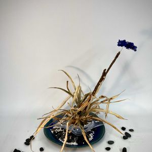久しぶりの一句🎶 群青の 地球(ほし)を巡りて 月に舞う ご無沙汰しております。 だいぶ久しぶりの投稿になります。 「月面でもしいけばなをするとしたら、どんなカタチになるか」をテーマに生けてみました。 青い塗装を施した胡蝶蘭をドライにして、地球に見立てて、月面の大地に凛と佇むパイナップルの葉っぱと石で月の荒涼感を表現してみました。 ドライ花材:胡蝶蘭(青色塗装) セミドライ花材:パイナップルの葉 花器:ガラスボウル+陶器皿