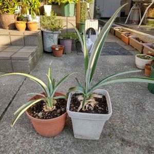 3代目パイナップル🍍登場✨(左) 1か月ほど前、兄にHONEYGLOWパイナップル🍍を買って貰ったので、食べたあとは我が家のパイナップル再生栽培の仲間入りしました🤭 HONEYGLOWはお値段も1100円とお高めなだけあって、とーーっても甘くて美味しいパイナップルでした😍 育ててまた食べたいっ😋 初代の台湾パイナップルは3年目に入ったけれど、既にサイズが変わらないくらいの大きさ!🤣 育ってきたらとんでもなく大きくなりそうだわッ😱 うふふ💕気長に育てま~す🤭