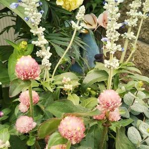 アンティークな色あいの千日紅♡ 見つけて思わずゲット☆ アフリカンマリーゴールドのヴァニラ、サルビアetc.と組み合わせてみたら、癒やされる雰囲気の寄せ植えになったー!
