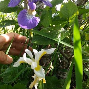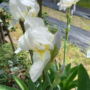紫色と白色の交配種のアヤメが出来ちゃいました😲✨✨ 紫色のアヤメは70㎝位の背丈 しろいろは40㎝位 交配種は50㎝位 花のサイズも色も中間だね😆✨✨