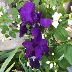 今日のお花:あやめ こんな優雅なあやめがうちの畑にあったかしらって咲いたの見てびっくり‼️ 煉瓦で花壇の仕切りをして旦那に刈られないようにしました。 後ろが荷物置き場にされてるので梅花卯木でちょっと隠しました😆 そうしたらちょうどフィレンツェのサッカーチームのカラーになりました⚽️💜