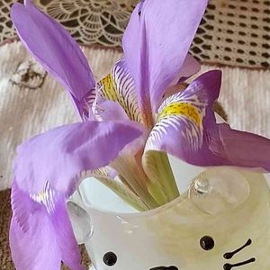 隣人が、お庭で咲いた花、2本持って来て下さいました〜。 同じ高さだったので、ちょっと細工をして高低をつけて備前焼の花器に生けました〜。 いづれアヤメか、カキツバタ、いったい何なのか、よく分かりません〜。 ✧◡̈⃝˖💙*✧˖◡̈⃝💜°✧◡̈⃝°💙*✧˖˖*