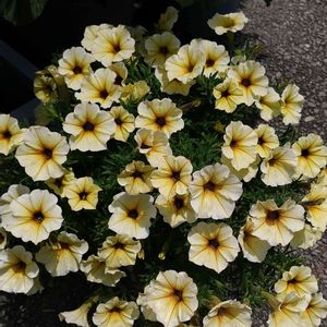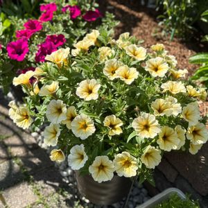 ペチュニア×カリブコア ビューティカル フレンチバニラ💛 雨に打たれても花が閉じにくいので 美しい姿を長期間楽しむことができるそうです モリモリ~😄