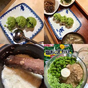 @きょうさんのずんた餅を見て、作ってみました。 コメント欄でアドバイスもいただきなから、挑戦しました、! お陰で美味しく出来ましたよ。 手作り初ずんたです。 ありがとうございました。 松島の笹かまやさんで、目の前の、焼き立てを頂き、ずんだ餅も頂いた事を、思い出しました。 美味しいお茶も入れて頂いて。 冷凍枝豆2袋、三温糖、大匙5、塩味は、ついているから、味見しながら好みの量で。 フードプロセッサーで細かくなる迄。 餅米2カップ、塩小さじやま1、水加減は、普通で炊く。 熱いうちに、スリコギで半殺しに。 半分潰したおはぎの餅を地方により、半殺しと言う。 半殺しのお餅を、濡らしたお皿に、お箸で丸く取り分ける。 アイスクリームディッシャーで取り分けて、のせてみました。 沢山出来たので、お隣にお裾分け。 画像訪問の皆様も、めしあがれ!