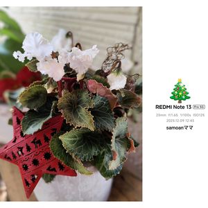 12/5投稿の寄せ植え 全体撮り直ししました。 小ちゃな狭いお庭なので 🤳パシャリ全体撮るのって難しい😅 ➄何年もまえからの クリスマス🎄雑貨ゴチャゴチャと とりあえず置いて😁 この寄せ植えの植物タグ 🌿葉物 葉物代わりに シルバーの葉のシクラメンを (遅咲きで何色が咲くかは、 ??だそうです。) 自家製 セリフラミンゴ🦩 (ピンクの斑が素敵な葉物 夏は、小ちゃな白いお花が咲く) 🏷️1日遅れてめんごめんご 🏷️毎月6日は私のイチオシ✌️フラワーの日 パンジーファビュラスで参加させて下さいね。🙇♀