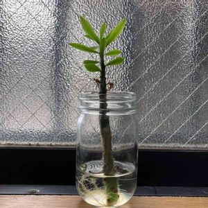 ペレスキオプシスの凄さ3 葉挿しが可能との事で試していた葉に根が出た。 このまま生長すれば立派なキリンウチワに?