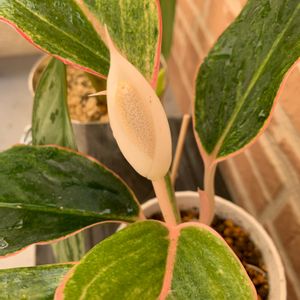 アグラオネマの花はこれが全開なんだろうか……🤔 びよ〜んって拡大して見てみたら、ざわざわ😣💦 集合体恐怖症の方は拡大注意です🤢