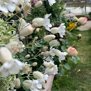 斑入りシレネユニフローラ 『ドレッツバリエガータ 』 ピエール様の横でゆらゆら❣ ぷっくり提灯袖のような姿が素敵💕 こちらは、花がないときでも斑入りの葉っぱが優しい💚 挿し芽でどんどん増える子なので、小さな鉢にいくつか、お庭を飾ってもらっています。 白いお花が清楚でお気に入り💕