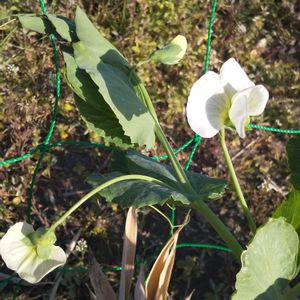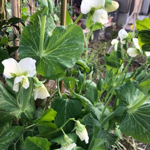 初めて種から育てた、スナップえんどうの花が咲き始めました~😊強風が吹くので、ネットに旨く這いませんが、大きくなーれ💖
