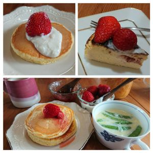 今年は庭で思いの外よく🍓が採れます🍓 🍓プレザーブ、🍓チーズケーキ、🍓ヨーグルトなどにして、 畑で採れたスナップえんどうのスープと🍽️