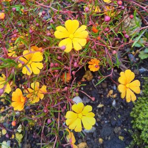 今日,植物園のロックガーデンで初めて出会った花。ヒルベルティア サニースマイルオレンジとサニースマイルレモン。オーストラリア原産。ディレニア(ビワモドキ)科ヒベルティア属の半耐寒性常緑低木。まだ小さい苗なので、低木には見えなかったな。花びらの形や色合いがとても可愛いかったよ。